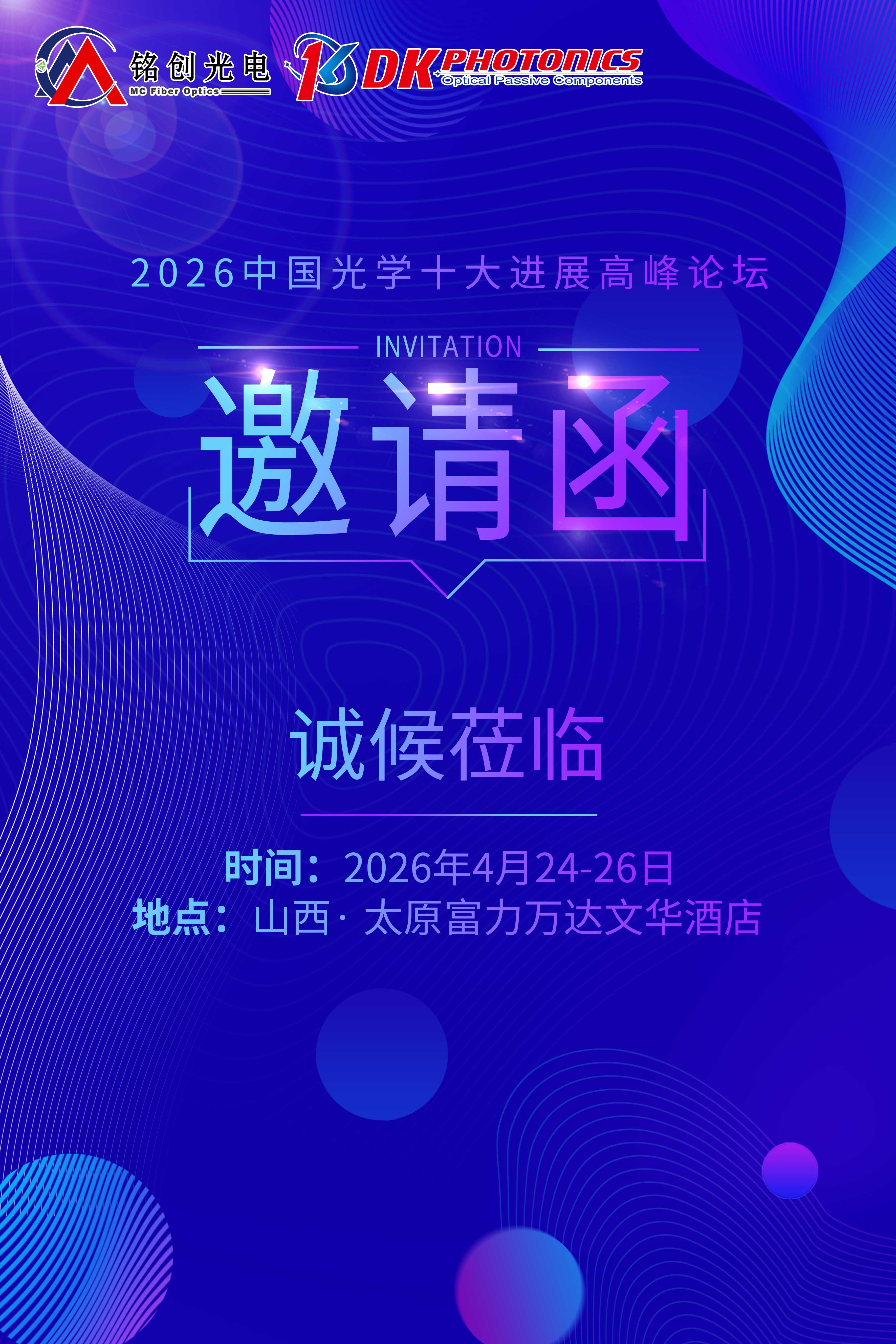 2026中国光学十大进展高峰论坛将于2026年4月24-26日在山西省太原市举办。作为保偏光无源器件领域的深耕企业,铭创光电受会议主办方邀请参展,此次将在现场重点展示短波长光纤器件、紧凑型光纤器件、高功率光纤器件、保偏光纤器件及产品应用方案。