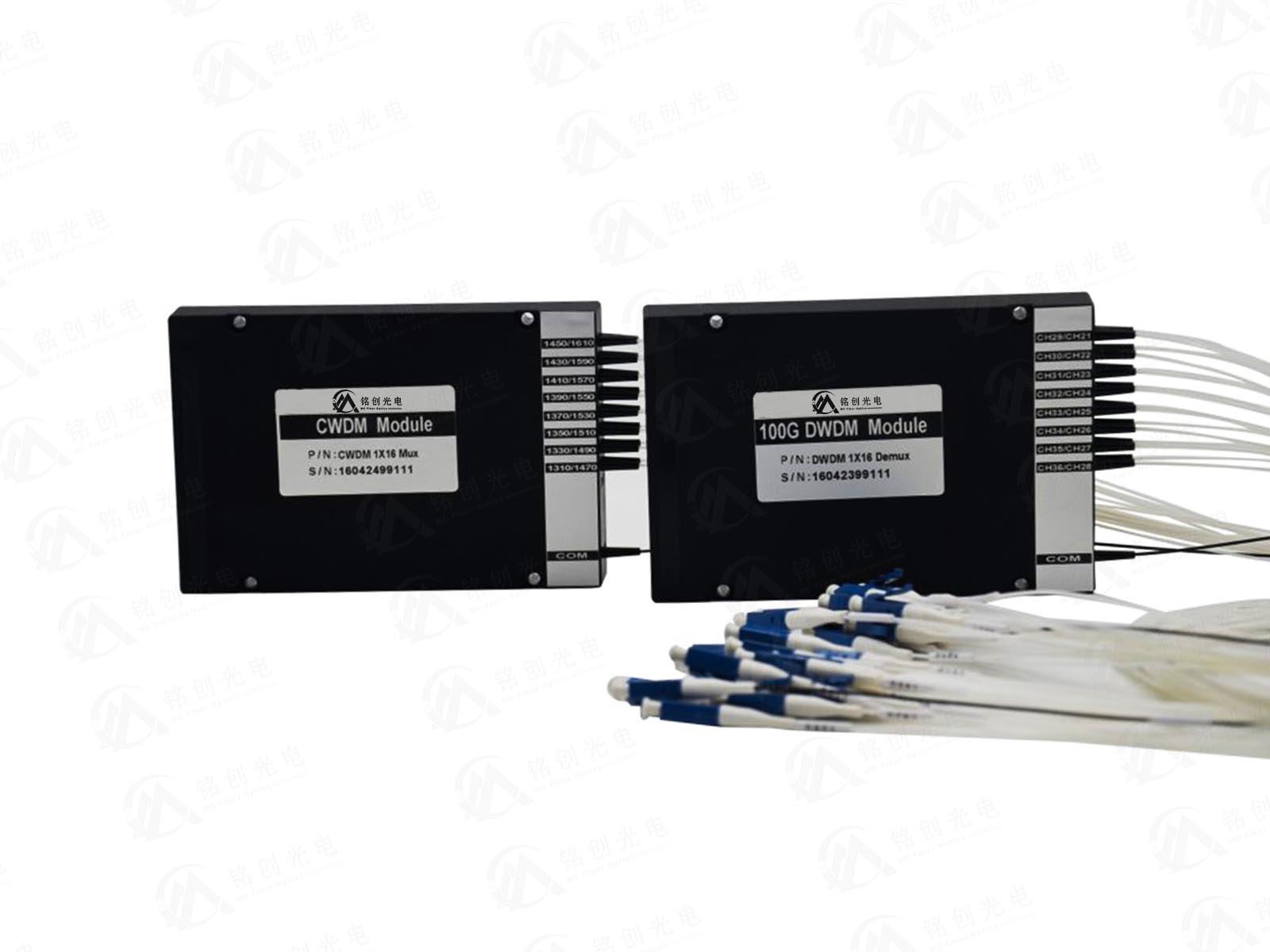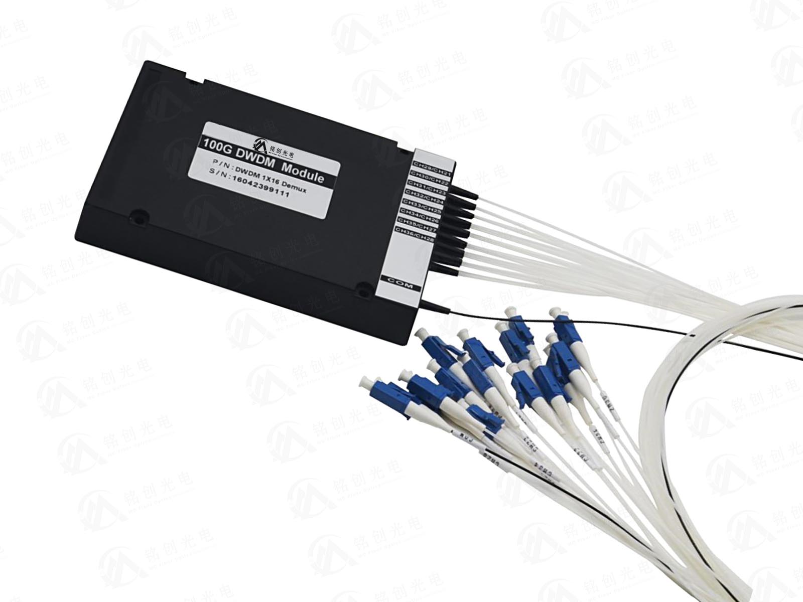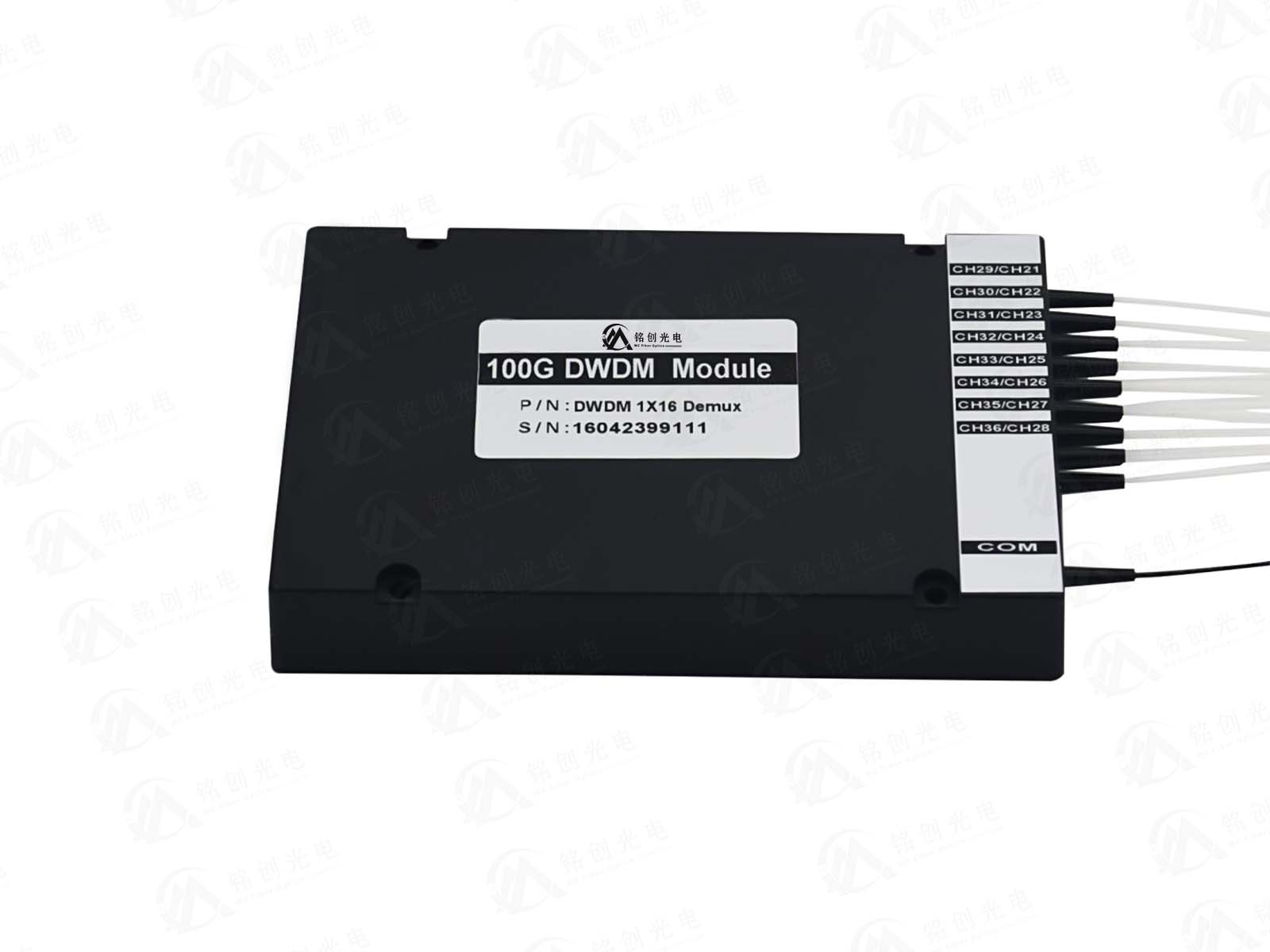 密集波分复用器是将不同波长的光信号复用至一根光纤上(复用),或将复用在一根光纤中的多个光信道按波长分开(解复用)。100G信道间隔密集光波分复用器/解复用器采用成熟的窄带介质膜实现光的滤波,波长稳定性好,采用密封工艺封装,环境稳定性高。 铭创光电可以提供ITU标准的100G通道间隔的波分复用器以及不同封装的模块。